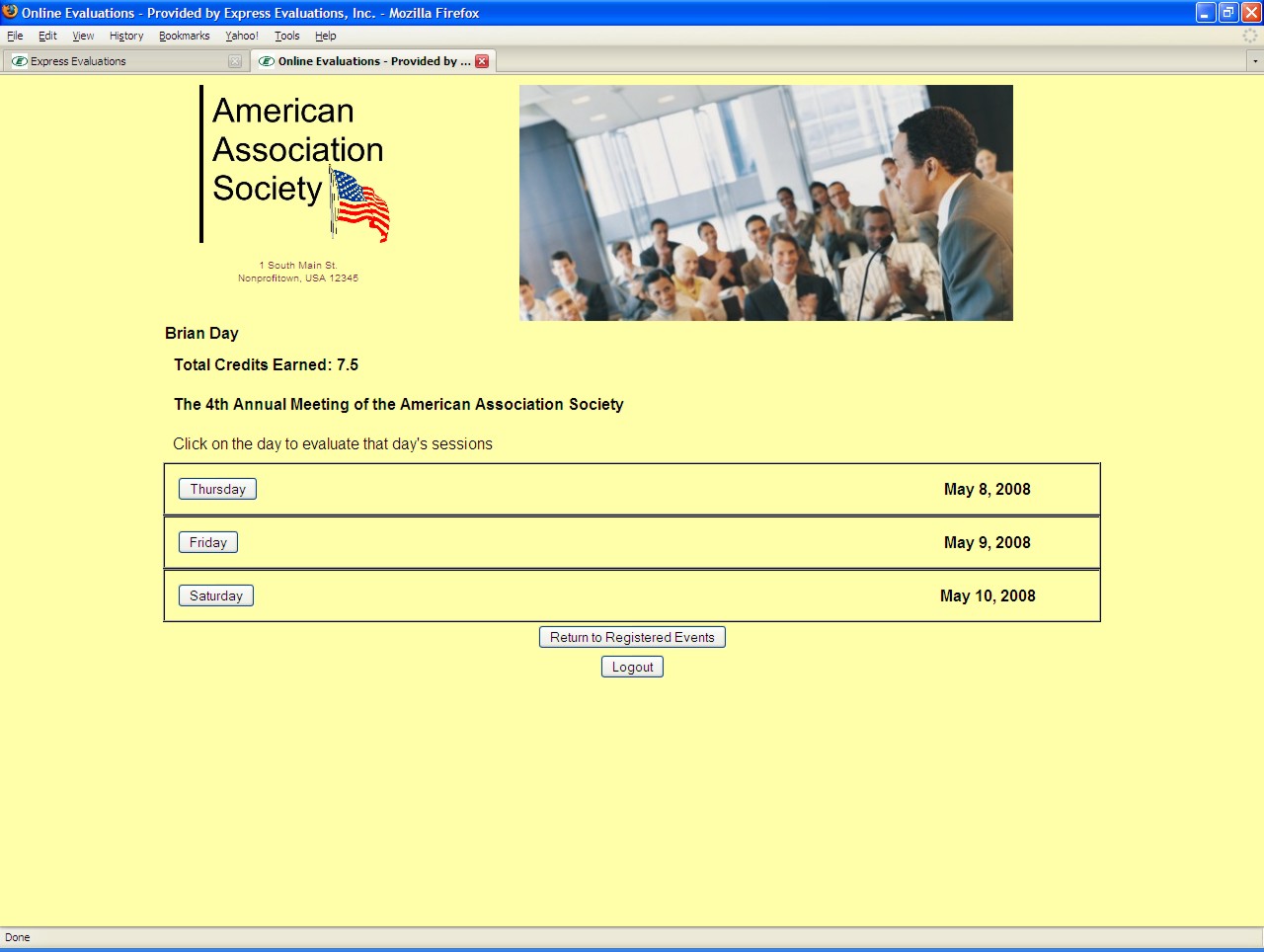 Simple access - The site can be accessed via a link from your organization's web site. If you have a "members only" section that is password protected, then the attendee can automatically be identified using a "single-sign-on" approach. That way all traffic is directed through your site. |