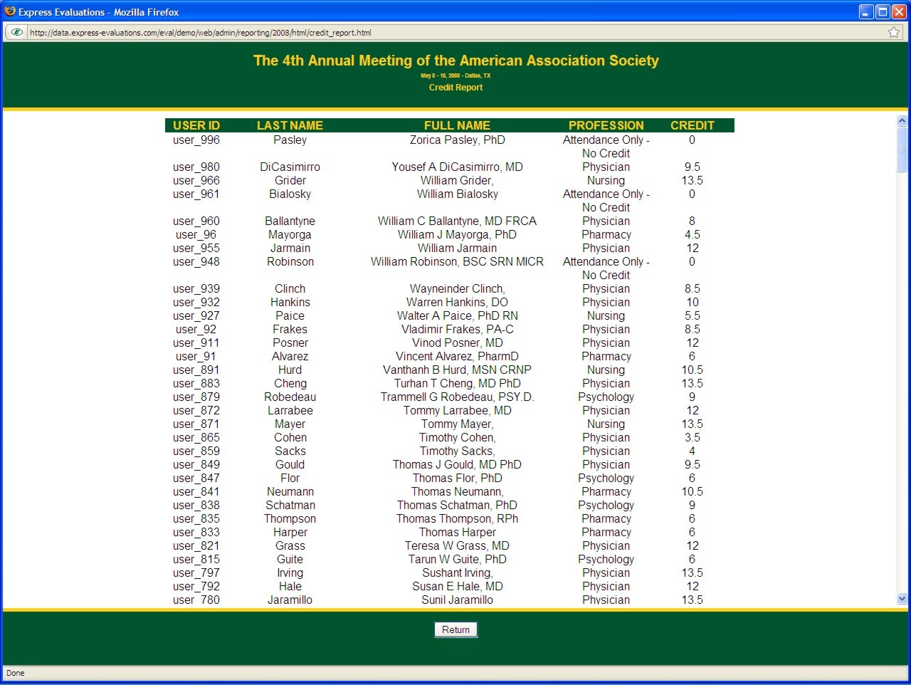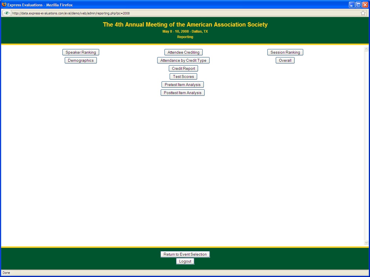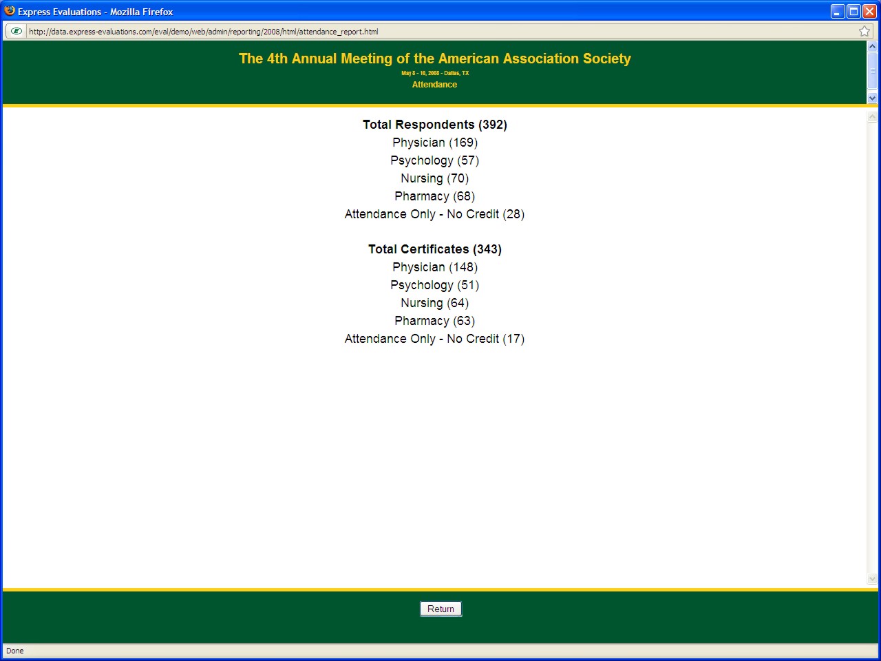 The administration area of the web site provides access to crediting details and copies of individual CE certificates. Standard reports, such as Session/Speaker reports, Session Ranking, Speaker Ranking, Attendee Crediting, and Demographic statistics, will be available on a near real-time basis (updated nightly). Some report examples are detailed below.
